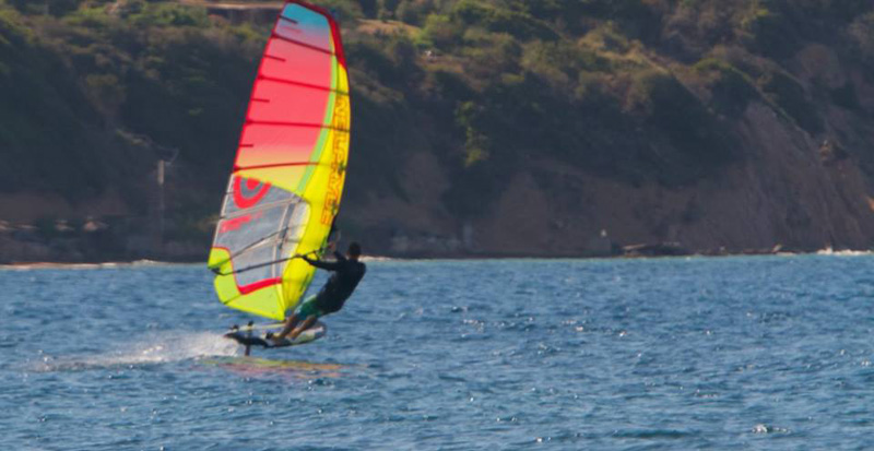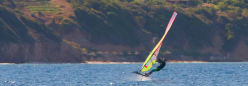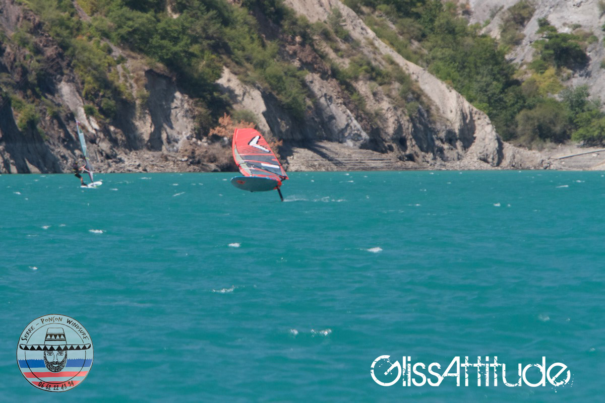 A la première risée, je mets la planche au planning assez facilement, mais le décollage n'est pas automatiquement comme j'en ai l'habitude. En poussant sur la jambe arrière, il vient très progressivement, et la planche fini par monter franchement et bien à plat. Habitué à naviguer avec des grandes ailes, j'avais oublié que, comme avec le F4, il fallait déclencher le décollage sur ces petites ailes.