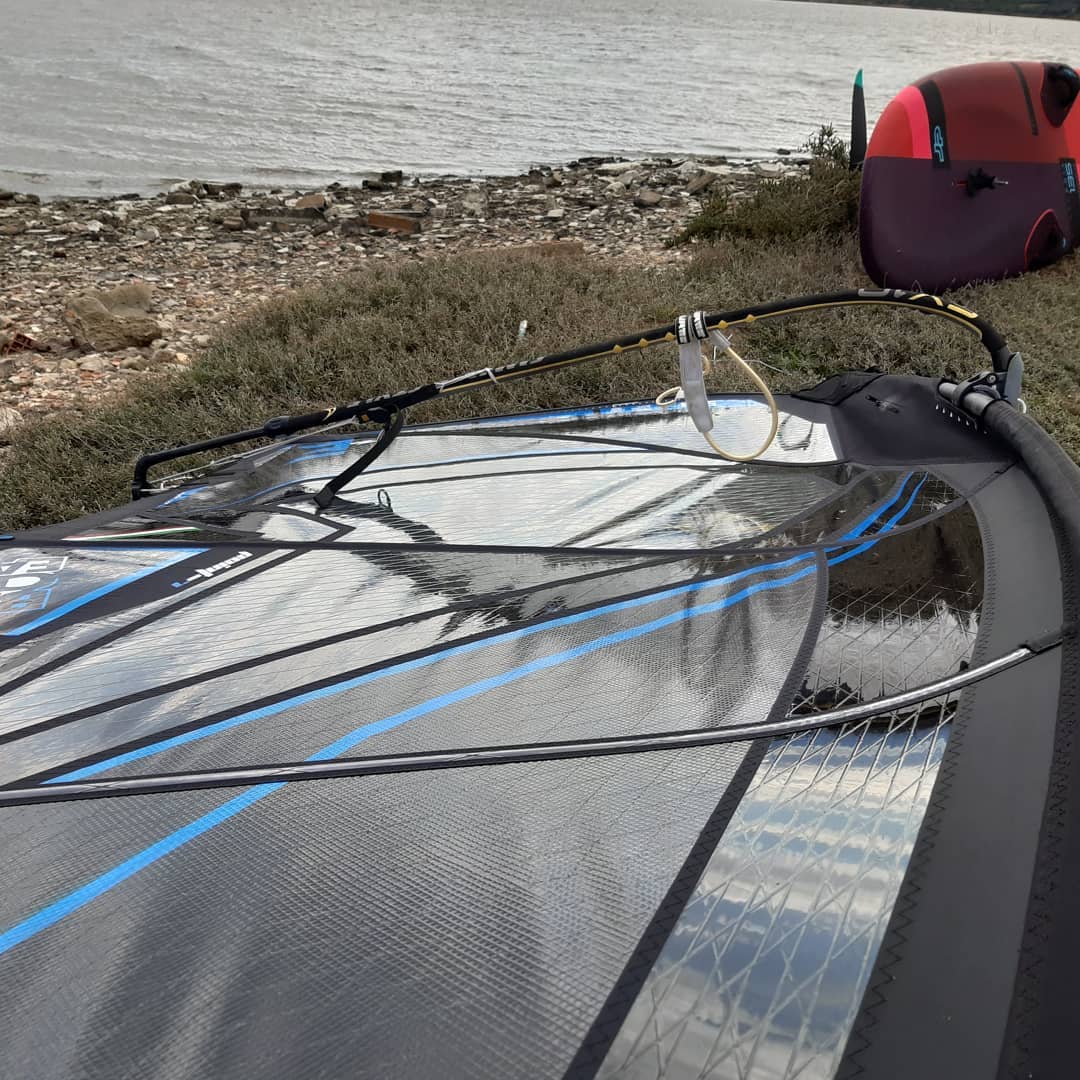 - Etarquée au repère "fin", la voile est plus tolérante que ma 5,2 de slalom ! La chute est ouverte comme une Point-7 classique, a cela s'ajoute l'usage d'un monofilm assez élastique en tête. J'utilise ce repère si je dois naviguer en aileron mais aussi en foil dans le vent fort et rafaleux.