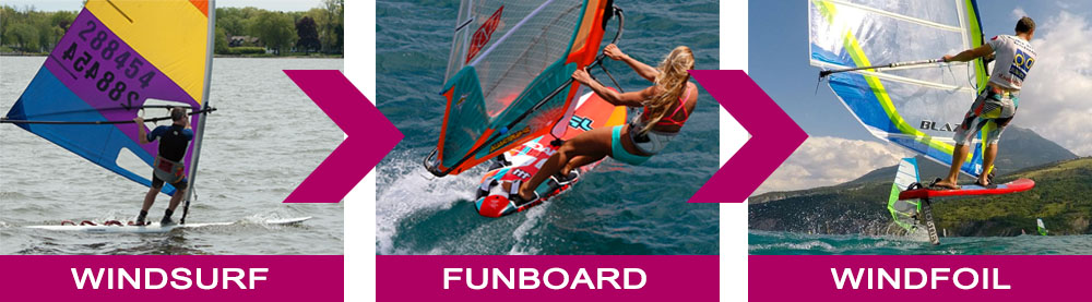 Le windfoil (ou windsurf à foil) est une nouvelle génération de glisse. Après la navigation en déplacement puis au planning, on passe à une navigation en vol. Les sensations de glisse font encore un bon en avant, en particulier grâce à une diminution drastique de la trainée. Et qui dit moins de trainée, dit moins de puissance vélique nécessaire, plus de légèreté etc. .. bref, une nouvelle révolution fondamentale dans le monde du windsurf.