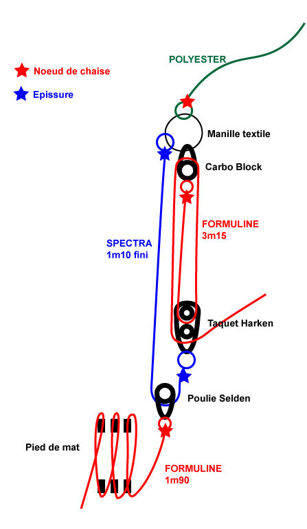 Vous pouvez les acheter au détail (Poulie forte charge, Poulie carbo T2, Taquet Harken, Formuline, Ligne spectra, bout polyseter), ou en kit tout fait (version pro, version eco), ou encore tout monté (je vous fabrique le palan avec la manille textile, les épissures etc. ... prêt à l'emploi)