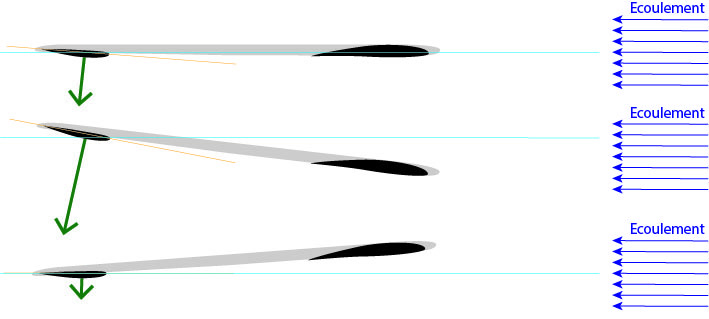 On rappelle qu'un profil d'aile se déplaçant dans un fluide génère une dépression sur son extrados, et crée une force vers le haut que l'on appelle "portance" (l'aile est aspirée par la dépression)