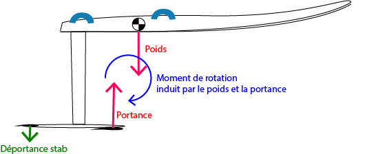 Compte tenu du point d'application de ces 2 forces, on remarque immédiatement que si elles étaient seules, la planche piquerait du nez. On a donc besoin d'une 3eme force qui compense le moment de rotation induit par le poids et la portance de l'aile. C'est justement le premier rôle du stab : assurer l'équilibre de l'ensemble.