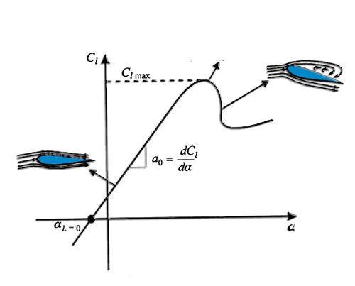 Plus l'aile est cabrée par rapport à l'écoulement (on parle d'incidence qui augmente), plus la portance devient forte ... jusqu'au décrochage. Ci dessous, le graphique montre l'évolution de la portance (Cl = coefficient de portance) par rapport à l'angle d'incidence. La portance augmente aussi avec la vitesse de l'écoulement.