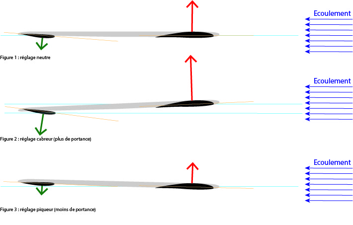 Je ne rentrerai pas ici en détail su toutes les conséquences du réglage de stab. Retenez simplement que le réglage de stab permet d'agir sur l'incidence de l'aile avant et donc