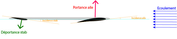 La figure ci dessus utilise des angles volontairement exagérés pour faciliter la compréhension. Dans les faits, l'angle d'incidence de l'aile principale est en général nul, et celui de stab de l'ordre de -4°.